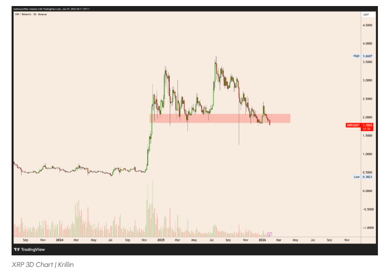 El analista de mercado Krillin llamó la atención sobre este rango de soporte de larga data el mes pasado. A medida que XRP mantuvo esta área a pesar de la caída en Q4 de 2025, elogió la resiliencia del activo, enfatizando que XRP había mantenido el soporte durante más de un año.