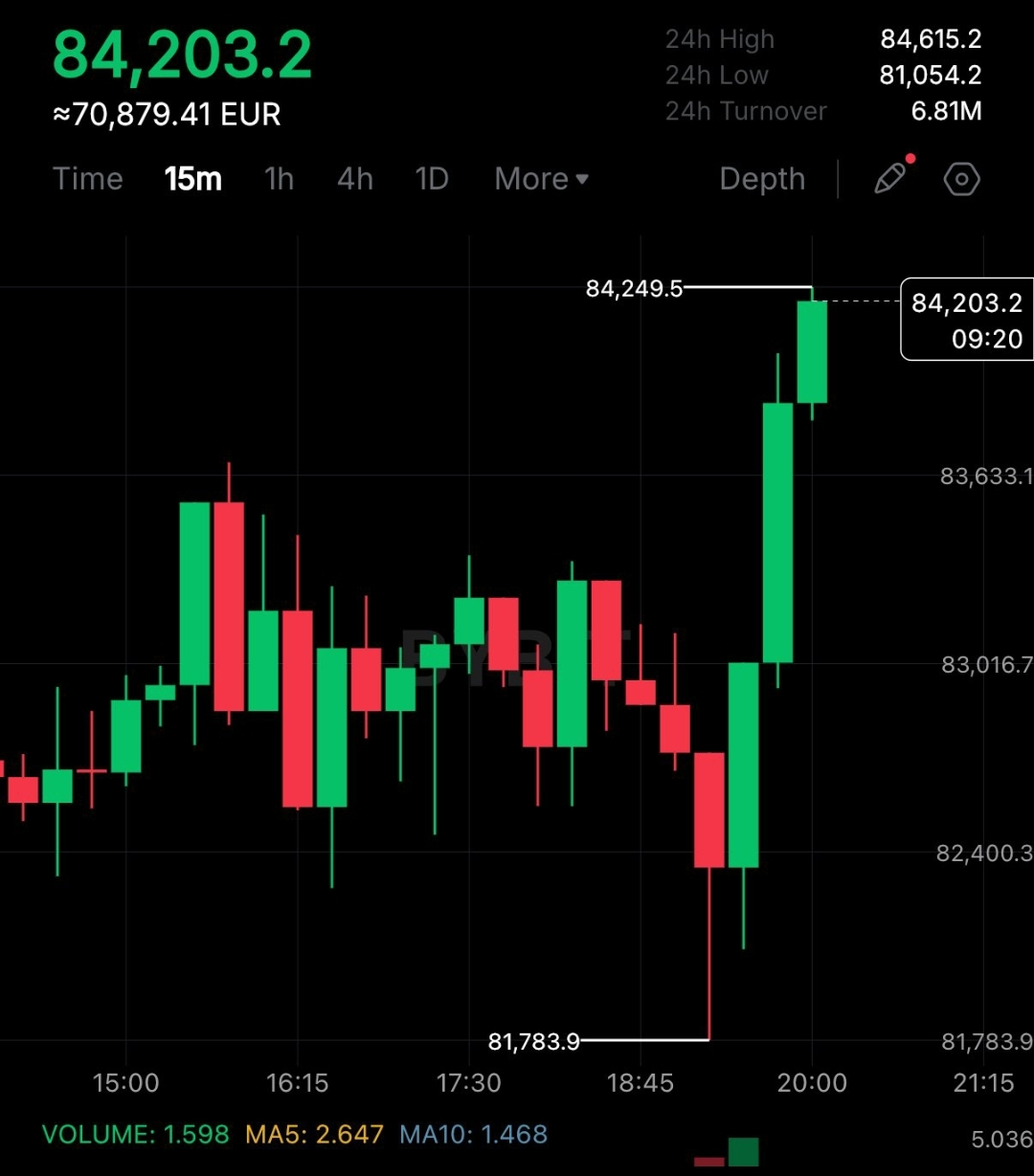 Bitcoin ($BTC): Recuperó $84,000 hoy, mostrando un enorme aumento de fuerza mientras los mercados tradicionales están en un pánico de "vender todo".