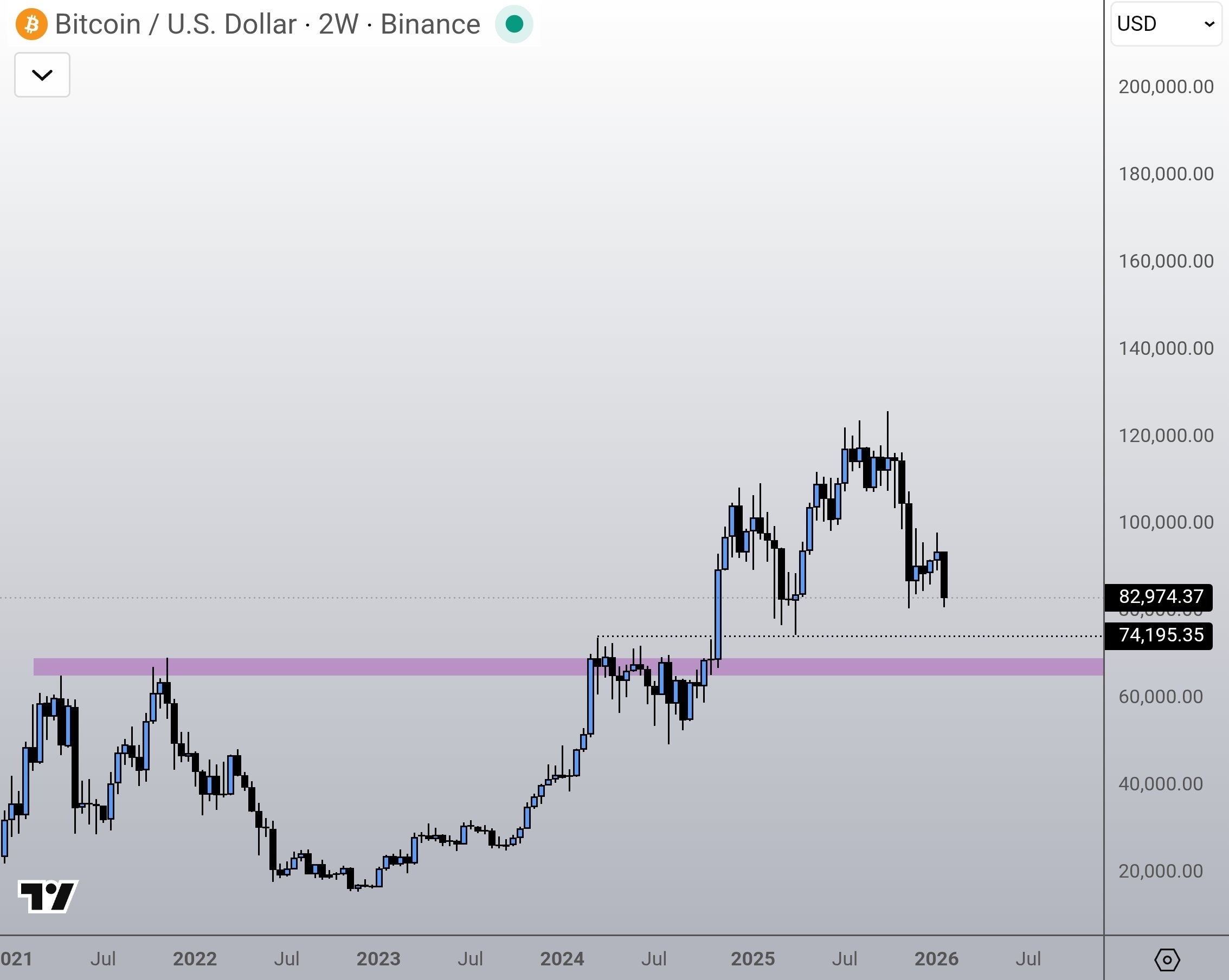 En un mercado alcista o bajista, cuando pones un número en tu mente puede hacerte dudar en la decisión — ni vendí temprano ni compré en el momento correcto. Pero si tengo que definir un rango, después de la ruptura de la estructura del mercado en octubre, veía la zona de 70 – 74 mil dólares.