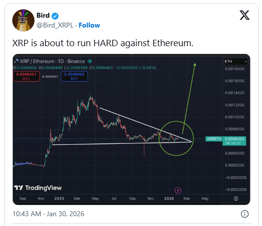 El análisis del pájaro apunta a un escenario donde XRP podría superar sus máximos anteriores contra Ethereum una vez que se resuelva la consolidación. El gráfico incluye una proyección con una flecha ascendente que se extiende abruptamente desde el vértice del triángulo, señalando una posible ruptura.