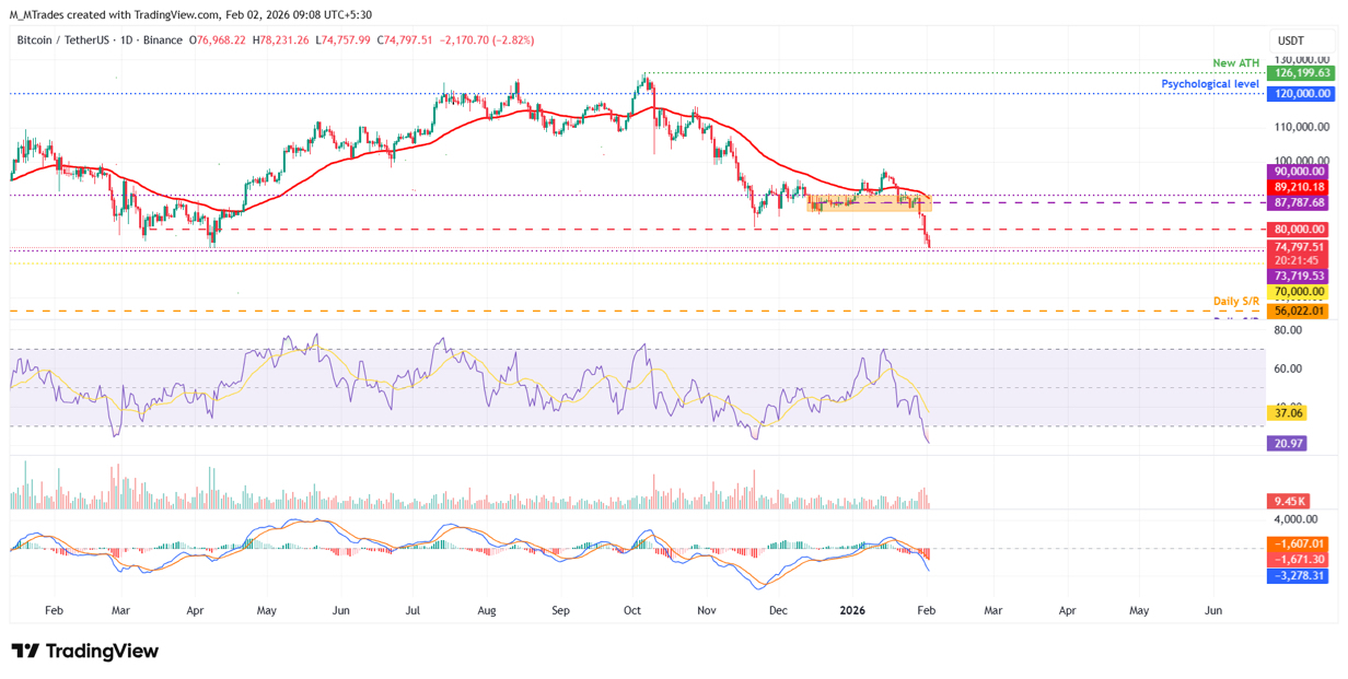 Si BTC sigue corrigiendo, la caída podría extenderse hacia el nivel psicológico clave de 70000 dólares.