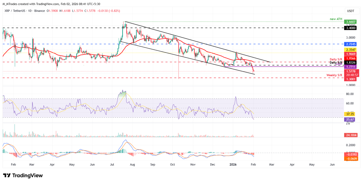 El precio de XRP cerró por debajo del nivel de soporte diario en 1.83 dólares el jueves y cayó un 12% en los tres días siguientes. A partir del lunes, XRP se cotiza a 1.57 dólares.