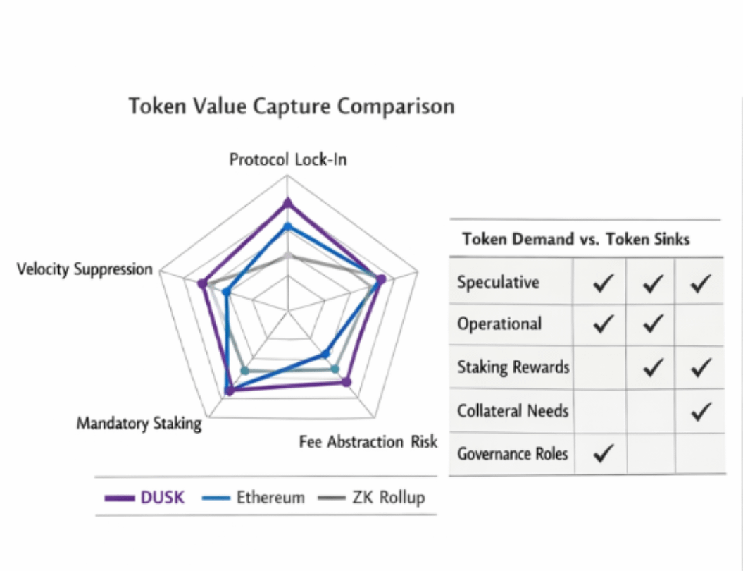 Esto nos lleva a la verdadera pregunta sobre el valor. Los tokens derivan su valor de una demanda que es duradera, inelástica y difícil de replicar. Para DUSK, la fuente más plausible de tal demanda no es "uso de la privacidad" en general. Es el poder de establecer estándares. Si DUSK se convierte en el protocolo por defecto para valores confidenciales compatibles, entonces emitir, liquidar y auditar esos activos debe requerir una interacción persistente con el token. Eso significa colateralización, riesgo de reducción, peso de gobernanza o staking reconocido por regulaciones que no puede ser eludido.