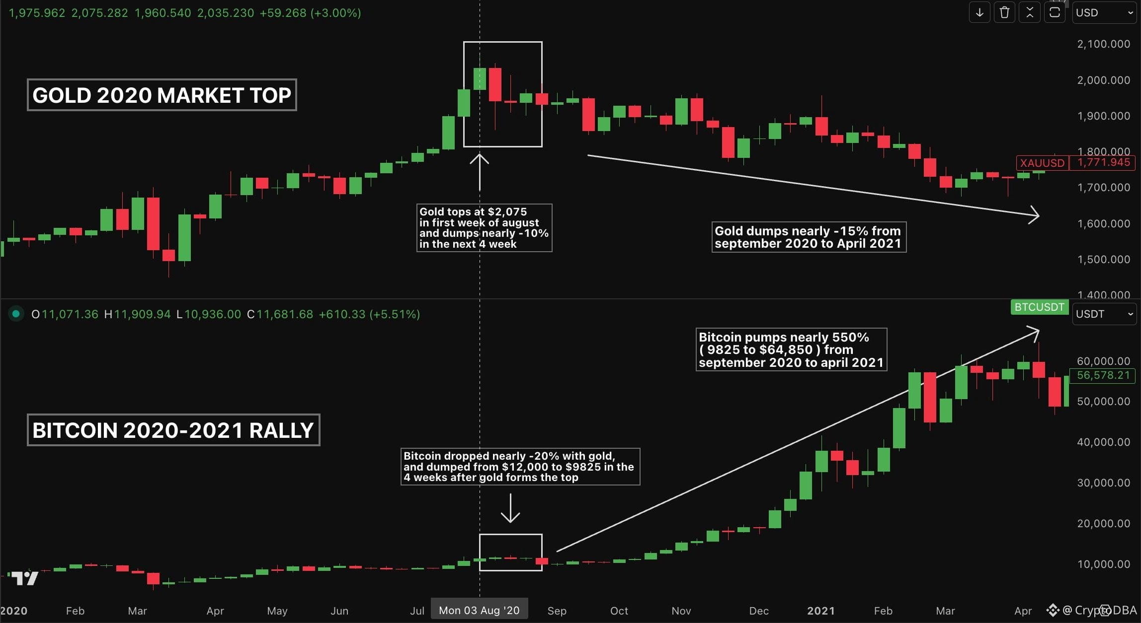 In August 2020, Gold topped at $2,075 and dropped nearly 10% in the next 4 weeks. $BTC also followed Gold and crashed nearly 20% from $12,000 to $9,800.