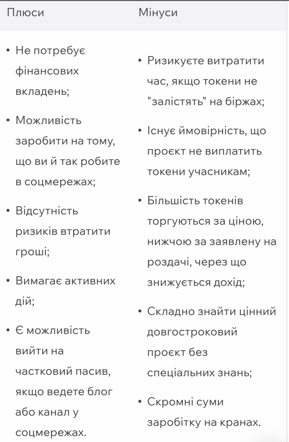 Las condiciones y requisitos para los participantes de la bounty son más altos, pero también se puede ganar más que en los airdrops. El riesgo de los airdrops y las bounties es que puede que gastes tiempo y no ganes nada si el proyecto, cuyos tokens se distribuyen a los usuarios, no se desarrolla y los mismos tokens no aparecen en ningún intercambio. Por lo tanto, la rentabilidad varía de cero a decenas de miles de dólares por un solo reparto.