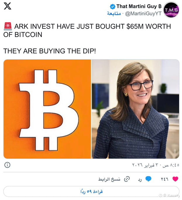 اشترت شركة ARK Invest، بقيادة كاثي وود، ما قيمته 65 مليون دولار من $BTC عبر صندوقها المتداول ARKB. وجاءت هذه الصفقة في 3 فبراير 2026، عندما تراجع سعر البيتكوين لفترة وجيزة إلى ما دون 100,000 دولار. وتُظهر هذه الخطوة أن بعض المستثمرين المؤسسيين لا يزالون واثقين من البيتكوين رغم تقلبات السوق على المدى القصير.