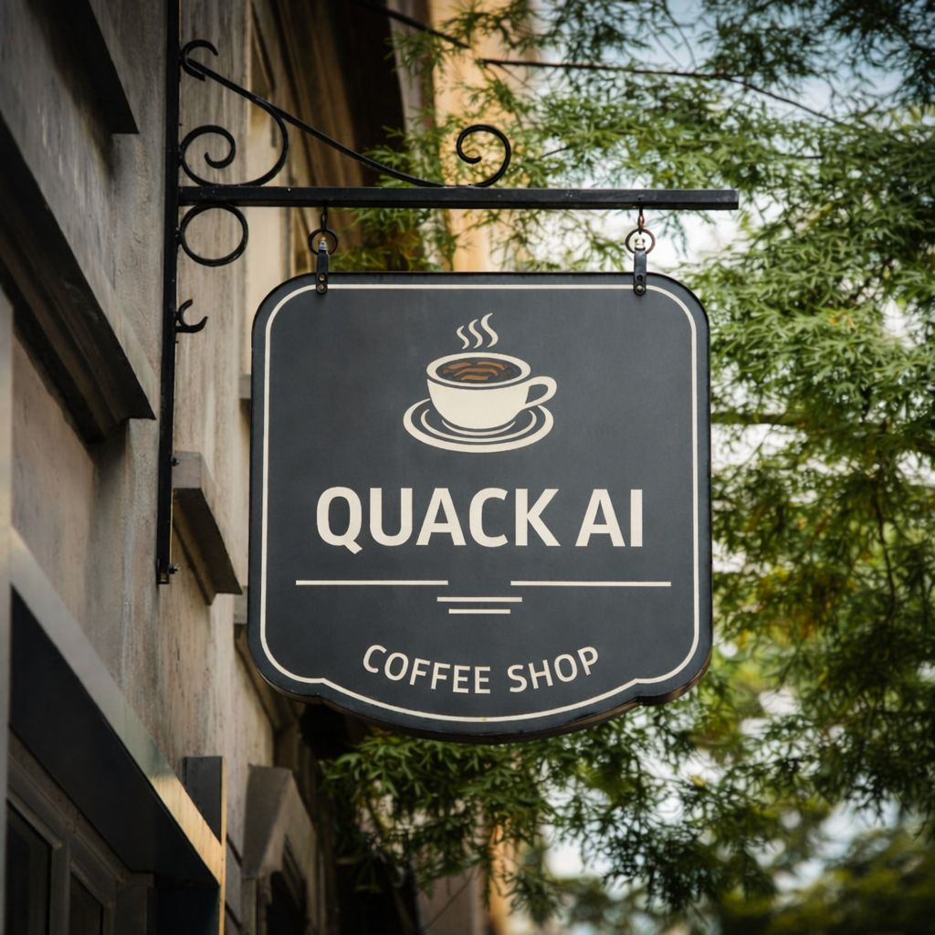 Imagina un lugar donde el cálido aroma del café fresco se mezcla perfectamente con el poder de la inteligencia artificial. Esta imagen captura un clásico letrero de cafetería colgante, elegante y atemporal, con una humeante taza de café como su pieza central. Pero este no es solo otro café: el audaz nombre QUACK AI se erige con orgullo en el centro, transformándolo en un símbolo de innovación, tecnología y cultura comunitaria moderna.