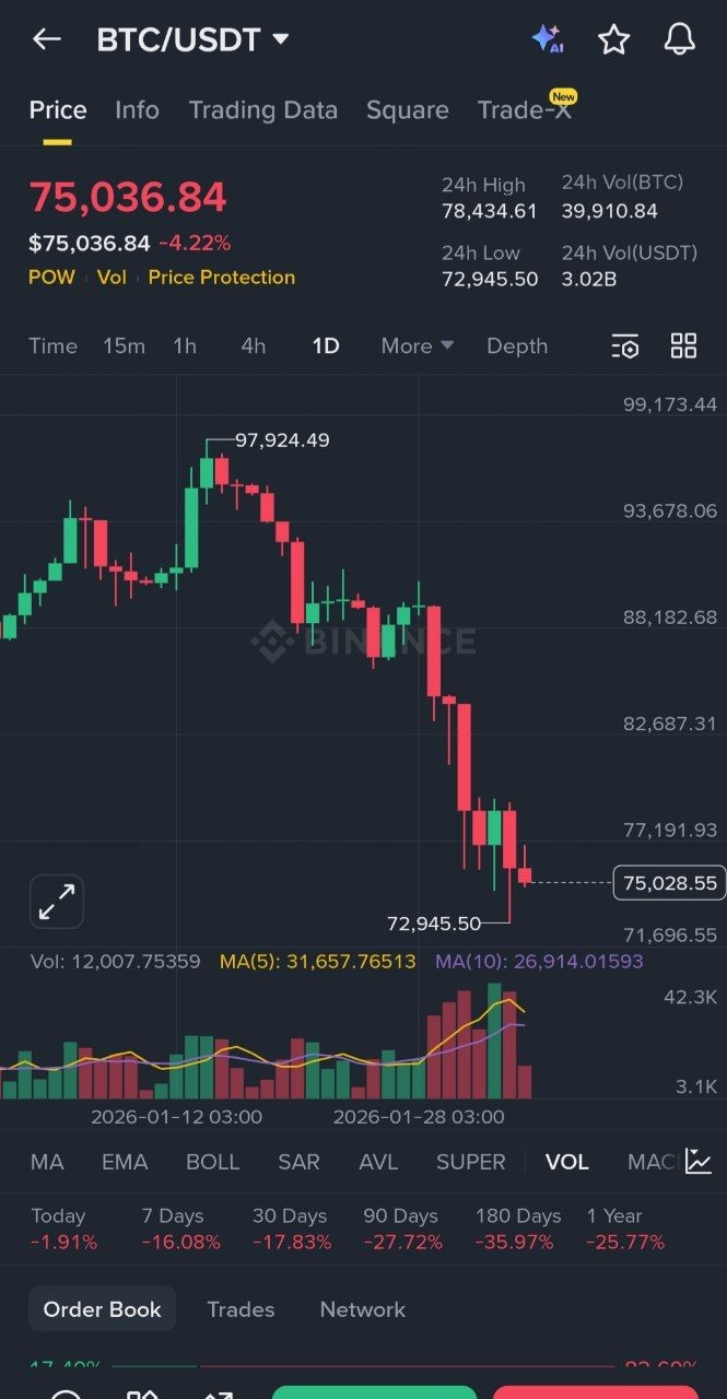 Chicos, lo que estábamos advirtiendo ha sucedido... Rompimos la barrera de los 74,000 dólares ayer, y este nivel era la última esperanza para los "toros" de demostrar que aún estamos en un mercado alcista. Ahora, todos están comenzando a convencerse realmente de que estamos en el corazón del "mercado bajista".
