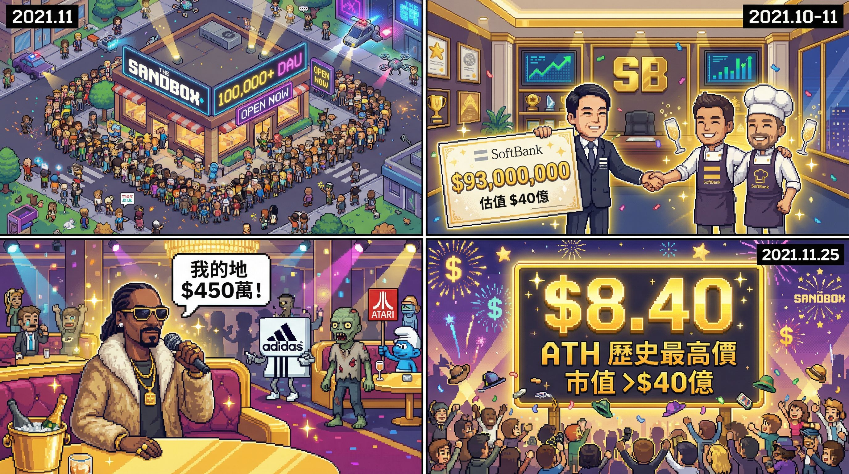 El token $SAND alcanzó su precio más alto en la historia de $8.4, lo que representa un incremento de 1000 veces en comparación con su precio de emisión de aquel entonces, con un volumen de transacciones diario que alcanzó los 4.6 mil millones de dólares.