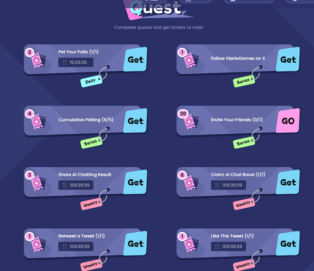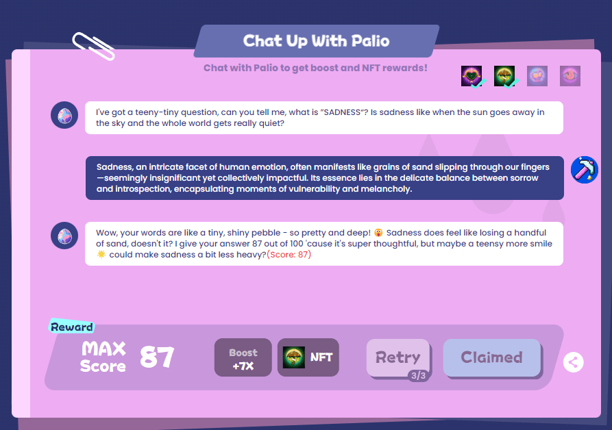 Luego, desplácese hacia abajo en la página y podrá ver que necesita interactuar con el chat de Palio, que en realidad es un chat de inteligencia artificial con IA. Una vez completado, además de obtener impulso, también puede desbloquear 4 NFT, recompensas y boletos;