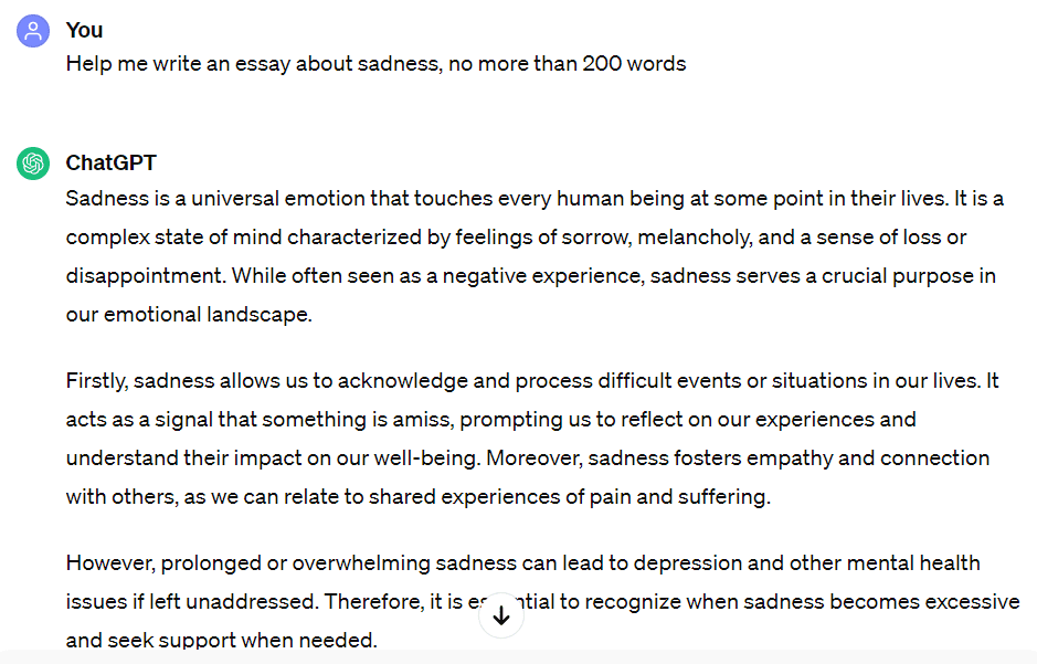 El tema del chat de la segunda etapa (8 de abril – 15 de abril) es arena. Se recomienda abrir Chatgpt (https://chat.openai.com/) e ingresar Ayúdame a escribir un ensayo sobre la tristeza, no más de 200 palabras. Y luego confirma, Chatgpt te ayudará a generar un artículo breve relacionado con la tristeza. Simplemente copia un párrafo. Es mejor no exceder las 300 palabras o puedes escribirlo tú mismo.