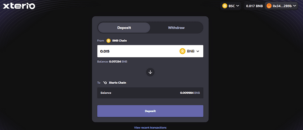 Vincular billetera, puente de la cadena BNB a Xterio, aproximadamente 5-10U, hacer clic en Depósito, confirmación de billetera;