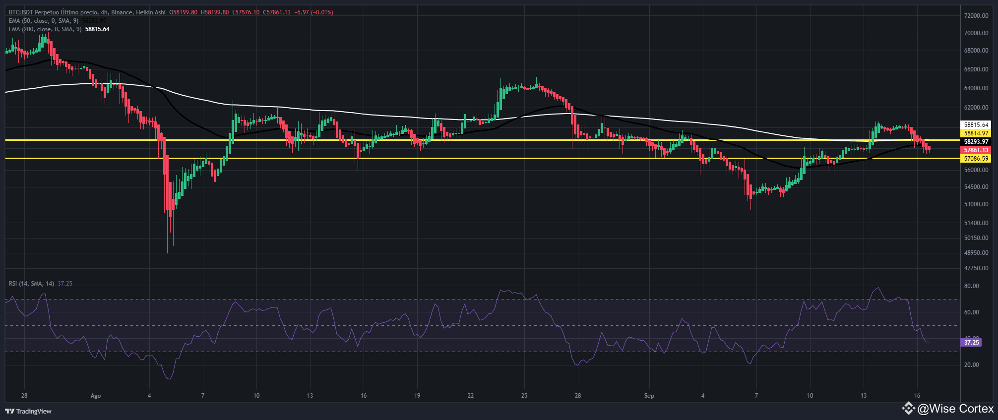 En este gráfico de 4 horas (utilizo esta temporalidad para hacer más dinámico el post) , usamos las EMAs de 50 y 200 días, junto con el RSI que configuramos previamente. La EMA de 200 días en $58,815 está actuando como una resistencia importante, mientras que el soporte inmediato está en $57,086. Si el precio no rompe la resistencia, podríamos ver una corrección hacia el soporte.El RSI está en 37.25, lo que indica que el mercado está cerca de niveles de sobreventa, lo que podría anticipar un rebote. Si el precio no logra romper la resistencia de $58,815, podríamos ver un movimiento a la baja hacia el soporte en $57,086. ✨ Nota importante: En el análisis técnico, hemos utilizado las EMAs y el RSI que configuramos previamente. Sin embargo, hay tantos indicadores como gustos, pero en muchos casos, menos es más. Mantener el gráfico simple y claro es clave para un análisis efectivo.