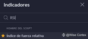 Como mostramos anteriormente, dirigite a Indicadores Técnicos. Escribí RSI en la barra de búsqueda y seleccioná "Índice de Fuerza Relativa" para agregarlo a tu gráfico. Este indicador te permitirá identificar si el precio de Bitcoin está en niveles de sobrecompra o sobreventa, no hace falta cambiar la configuración por defecto.