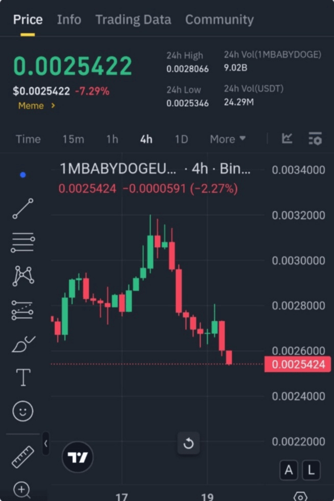 El par $1MBABYDOGE/USDT está navegando a través de una intensa presión bajista, poniendo a prueba un soporte crucial en $0.0025000. Una ruptura por debajo de este nivel podría señalar una mayor caída, mientras que una recuperación podría ofrecer una perspectiva alcista a corto plazo con resistencia en $0.0028000.