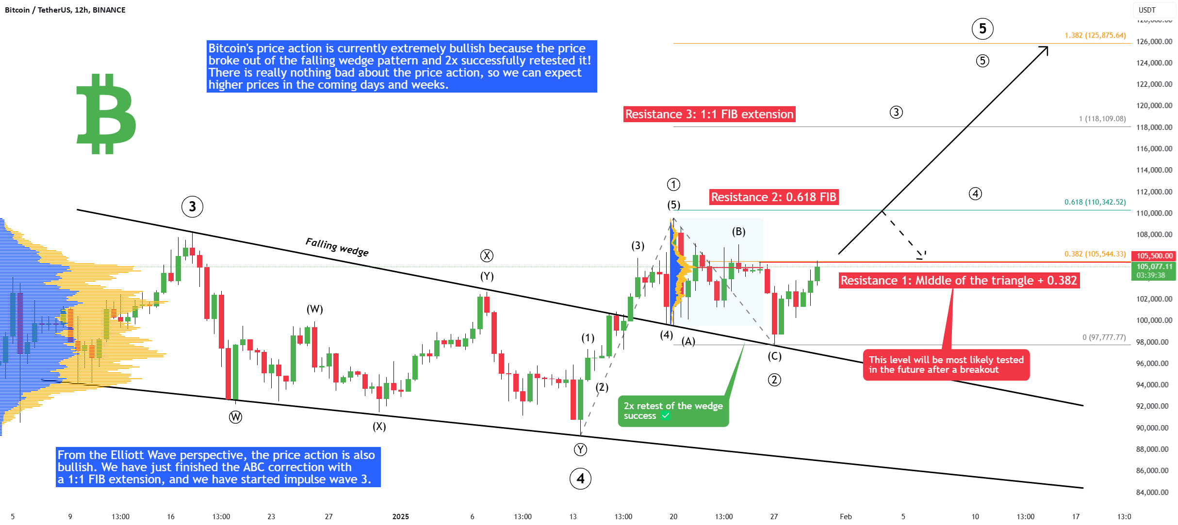 En el gráfico podemos ver 3 niveles fuertes que puedes usar para tus decisiones de trading. El primer nivel está en 105,544 USDT (0.382 FIB y POC del triángulo simétrico). Este nivel probablemente será probado en un futuro cercano después de una ruptura. Eso significa que Bitcoin puede bombear a 110k y luego volver y volver a probar este nivel antes de continuar al alza. El segundo nivel es 110,342 USD. Este nivel también es muy fuerte porque es la extensión de 0.618 FIB de la onda 1 a la onda 2. También está por encima del máximo histórico anterior, por lo que podemos esperar un barrido de liquidez por encima de este máximo oscilante y luego una tendencia bajista a corto plazo. El tercer nivel está en 118,109 USDT. Este también es un nivel significativo porque tenemos una extensión de FIB 1:1, y es posible que sepas que Bitcoin reacciona de manera bastante confiable a esta extensión. Es uno de los mejores.