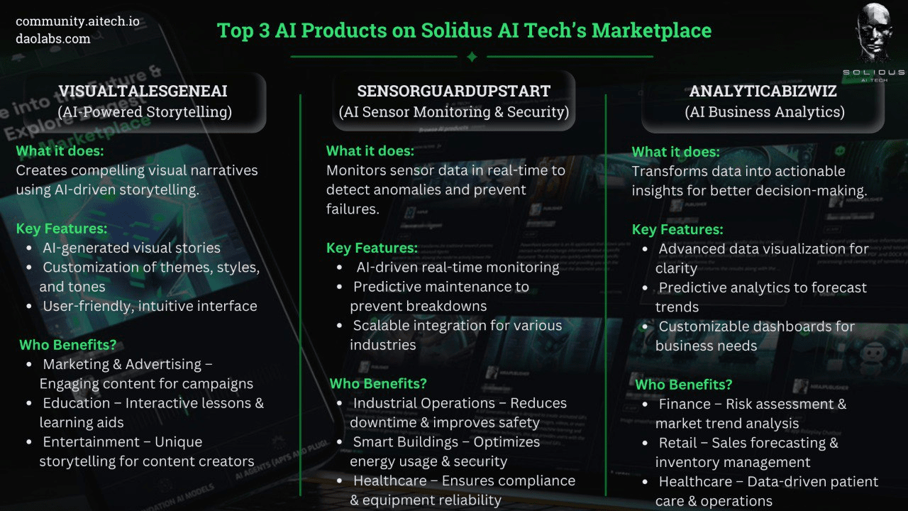 La Inteligencia Artificial (IA) está transformando las industrias, ofreciendo soluciones de vanguardia para mejorar la productividad, la seguridad y la toma de decisiones. Solidus @AITECH el Mercado está a la vanguardia de esta revolución, proporcionando herramientas innovadoras impulsadas por IA que optimizan diversas operaciones comerciales. En este artículo, exploramos tres productos destacados de IA que muestran una innovación, funcionalidad e impacto excepcionales: VisualTalesGeneAI, SensorGuardUpStart y AnalyticaBizWiz.