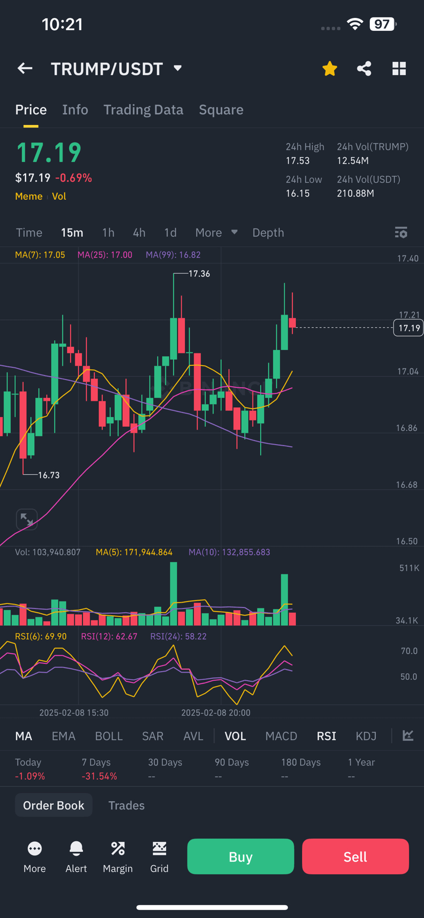 Los promedios móviles de corto plazo (7 y 25) están por encima del MA de largo plazo (99), lo que sugiere un impulso alcista en el corto plazo.