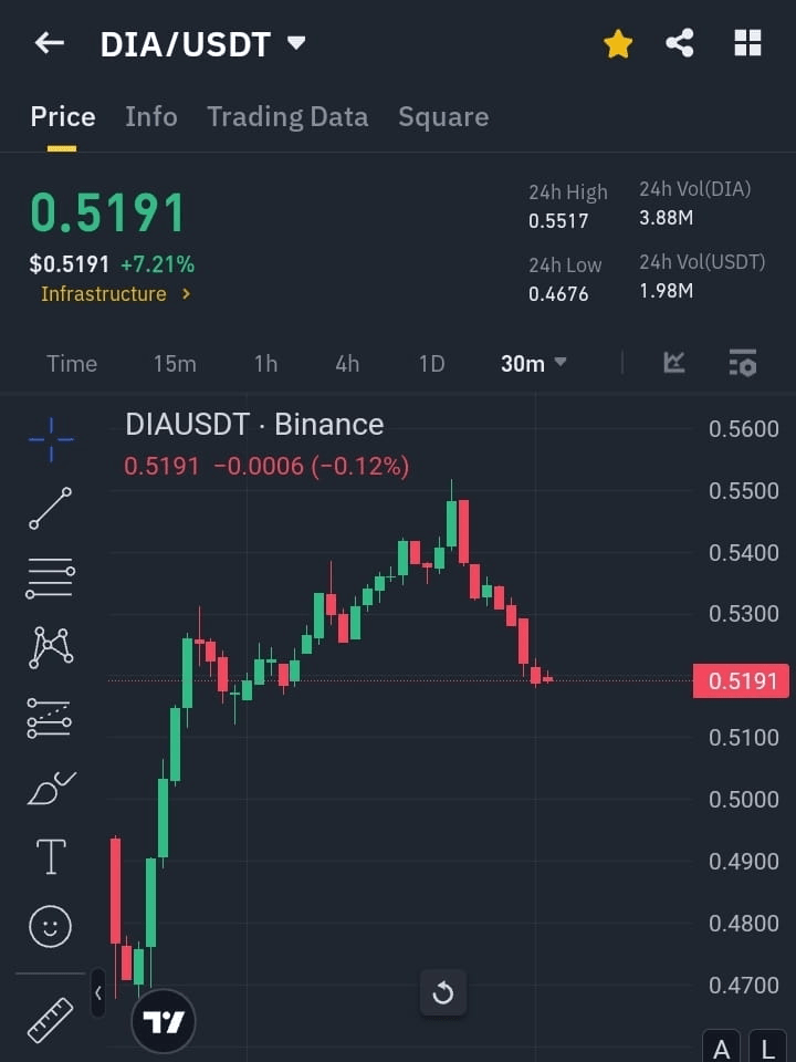 Rechazo de Resistencia: $DIA ha estado luchando por romper por encima de la zona de resistencia de $0.5300 - $0.5500, con múltiples intentos fallidos.