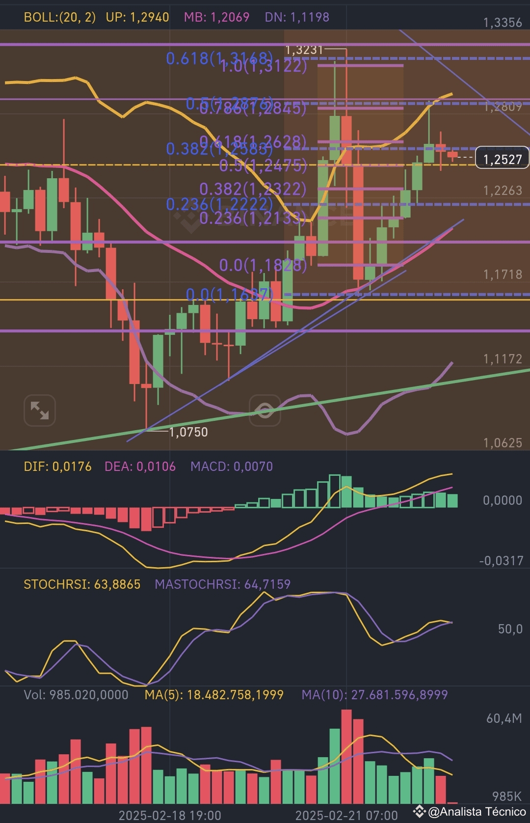 1.2475 (50% Fibonacci): Nivel de soporte principal, su ruptura indicaría un cambio de tendencia.
