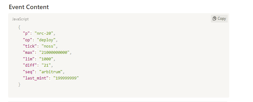 En el protocolo Noscription, todas las operaciones, incluida la implementación, la transmisión y la transferencia, son eventos uno por uno. Al igual que en Brc20, todas las operaciones se registran en el siguiente formato json.