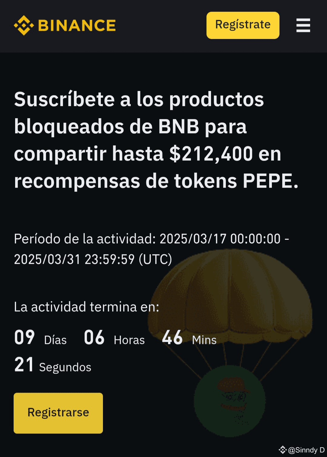 Suscribete a los productos bloqueados de $BNB para compartor hasta $212.400 en recompensas de tokens $PEPE