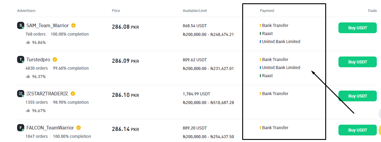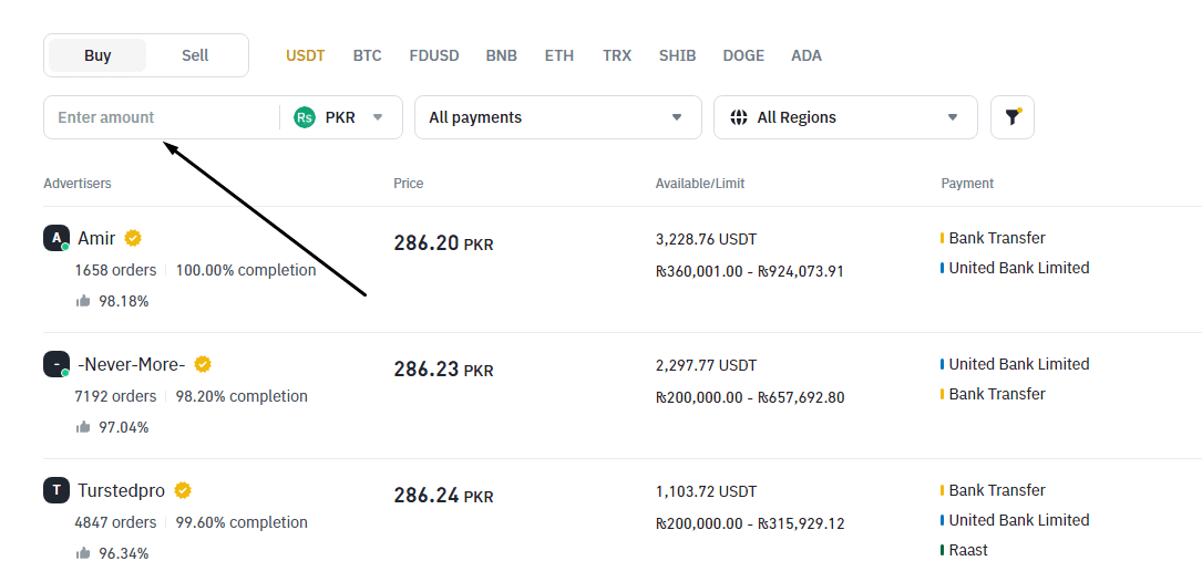 Luego selecciona tu moneda con la que deseas comprar. Puede ser PKR, SAR o cualquier moneda nativa que desees. Puedes usar la opción de búsqueda para una búsqueda rápida.