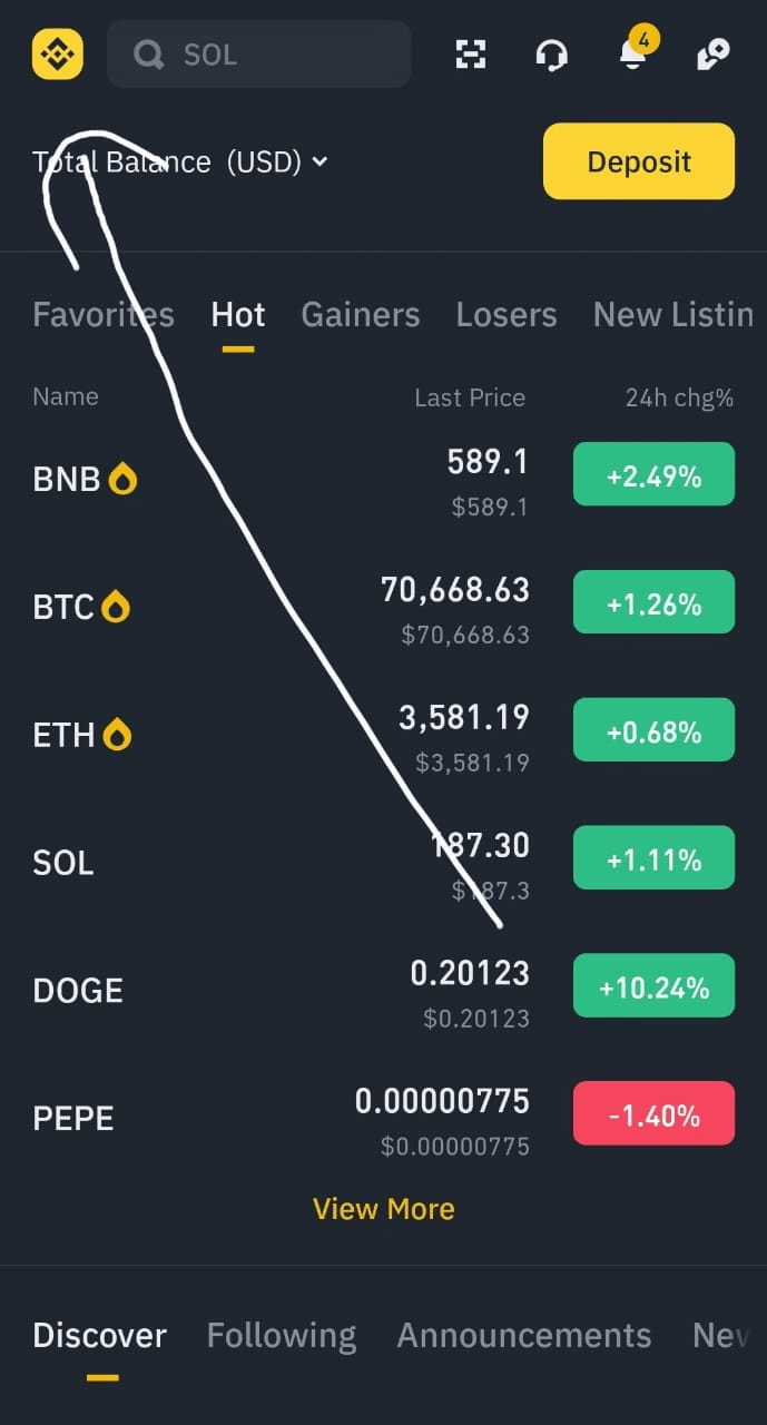 Si deseas depositar usando la aplicación móvil, "Haz clic" en el logo de Binance en la parte superior derecha.