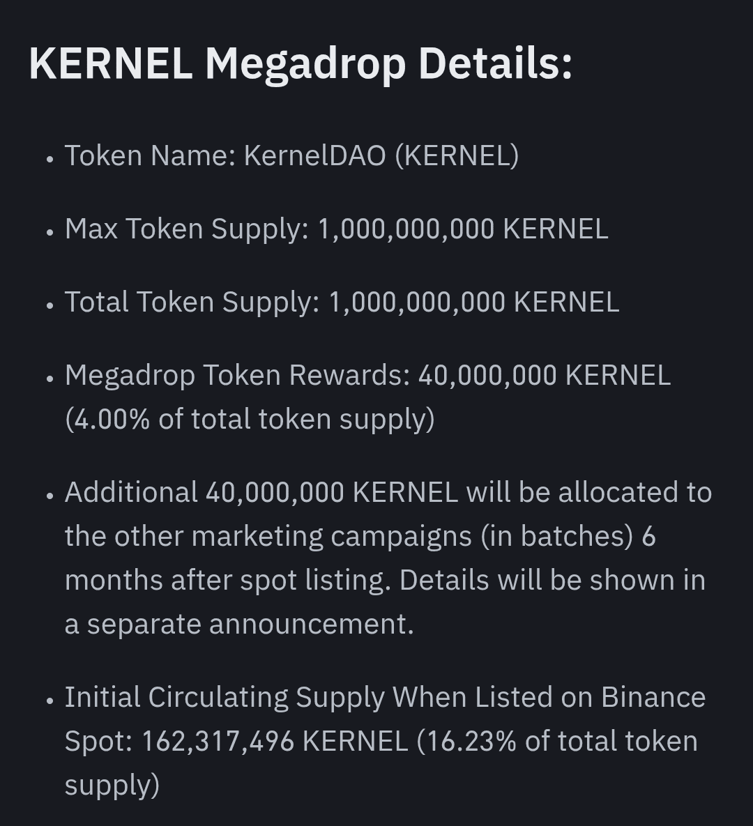Asignación Total de Megadrop: 40,000,000 KERNEL (4% del suministro total) se dedica a recompensas comunitarias a través del evento Megadrop.