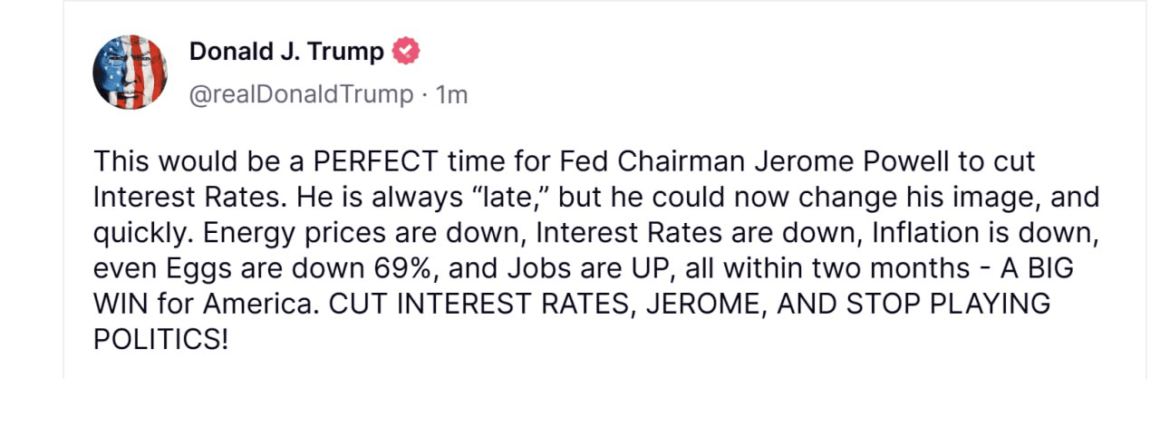 ◈ Mientras escribía, Trump publicó un mensaje exigiendo que Jerome Powell recorte las tasas y deje de jugar a la política.