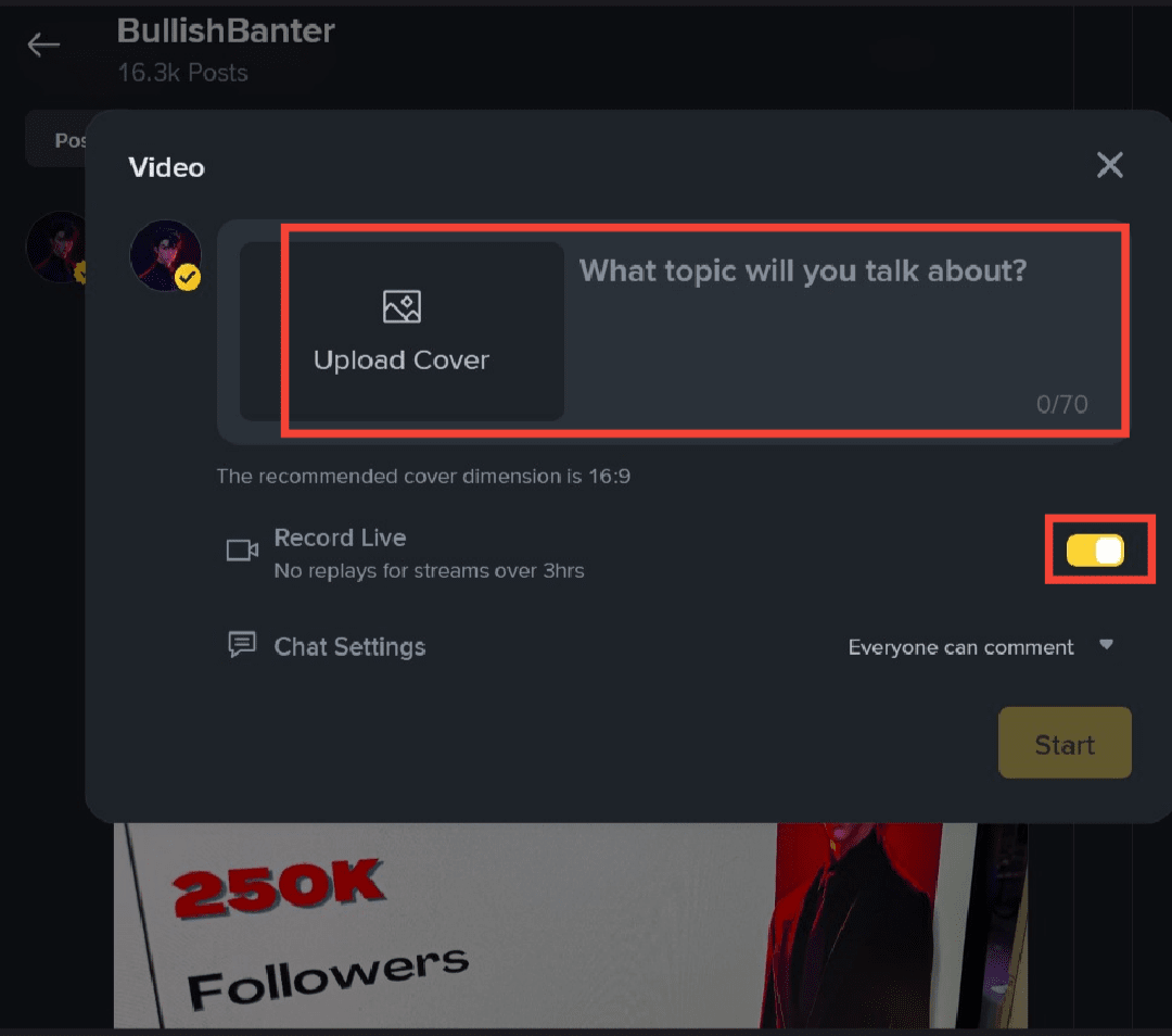 También hay una opción de “Grabar en vivo” – activarla guardará automáticamente la repetición de tu transmisión en tu perfil.