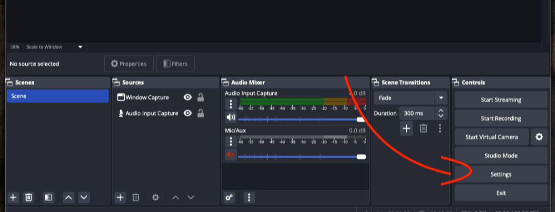 En OBS, ve a la sección de Configuración (esquina inferior derecha).