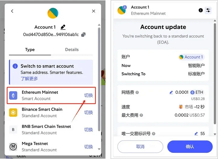 Accede a la interfaz de detalles de la cuenta en la billetera, haz clic en el botón de cambiar, lo que permitirá al usuario cambiar de su cuenta en Ethereum Mainnet a una cuenta EOA normal.