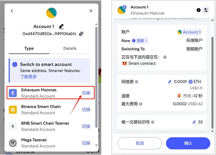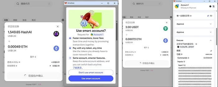Proceso de actualización:cuando el usuario interactúa con ciertas DApps en la cadena, Metamask sugerirá activamente al usuario que la transacción actual se puede completar mediante la actualización a una cuenta inteligente usando el método de envío masivo. Por ejemplo, al realizar un intercambio de ciertos tokens en Uniswap, al hacer clic en el botón Usar cuenta inteligente, se actualiza a una cuenta inteligente, y luego la autorización del token y el intercambio se completarán en una sola transacción.
