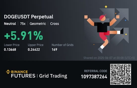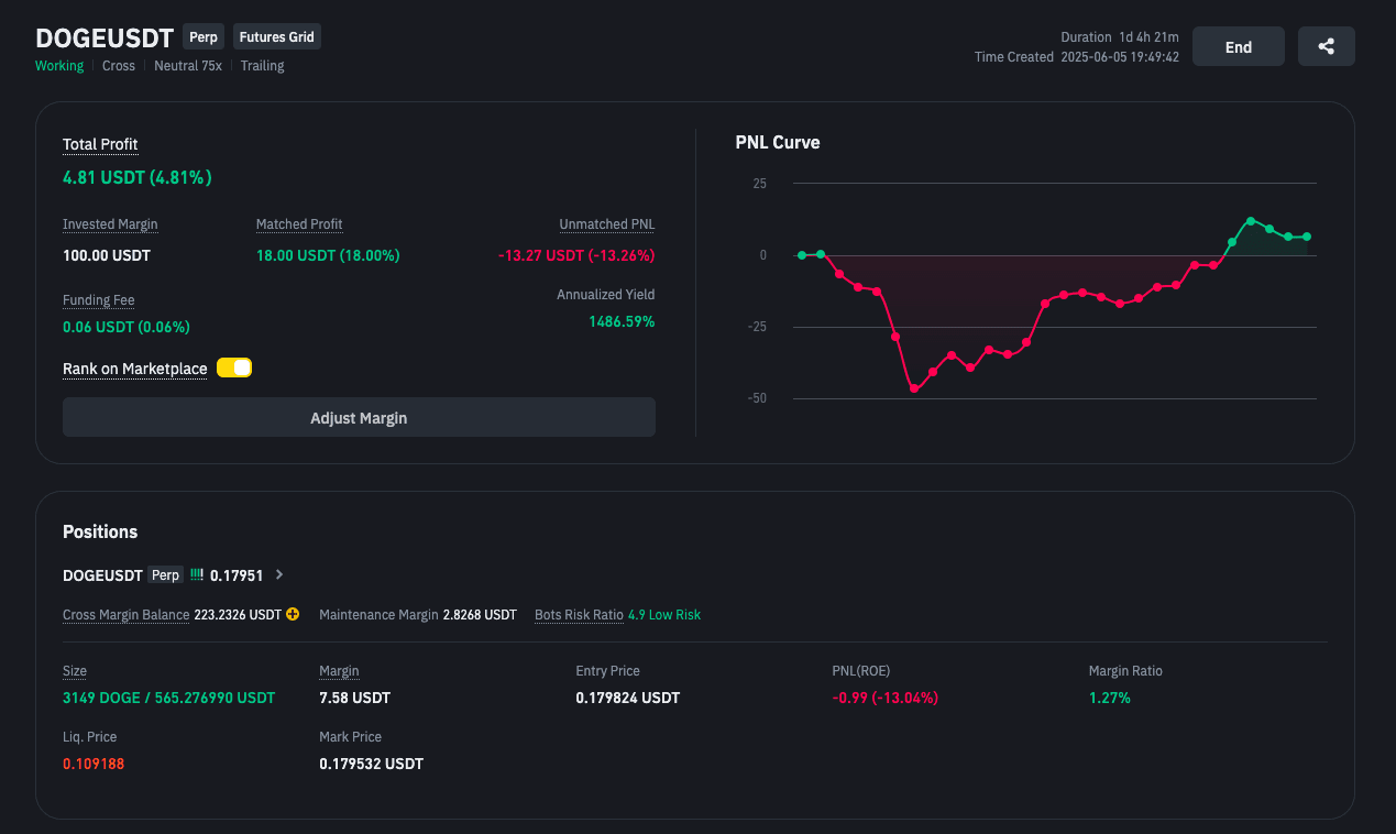 Lancé mi bot DOGEUSDT Perp|Neutral 75x|Trailing con una modesta inversión de $100 USDT. La estrategia era simple pero poderosa: capturar la volatilidad dentro de un rango de cuadrícula cuidadosamente calculado de 0.136680 USDT a 0.244220 USDT.
