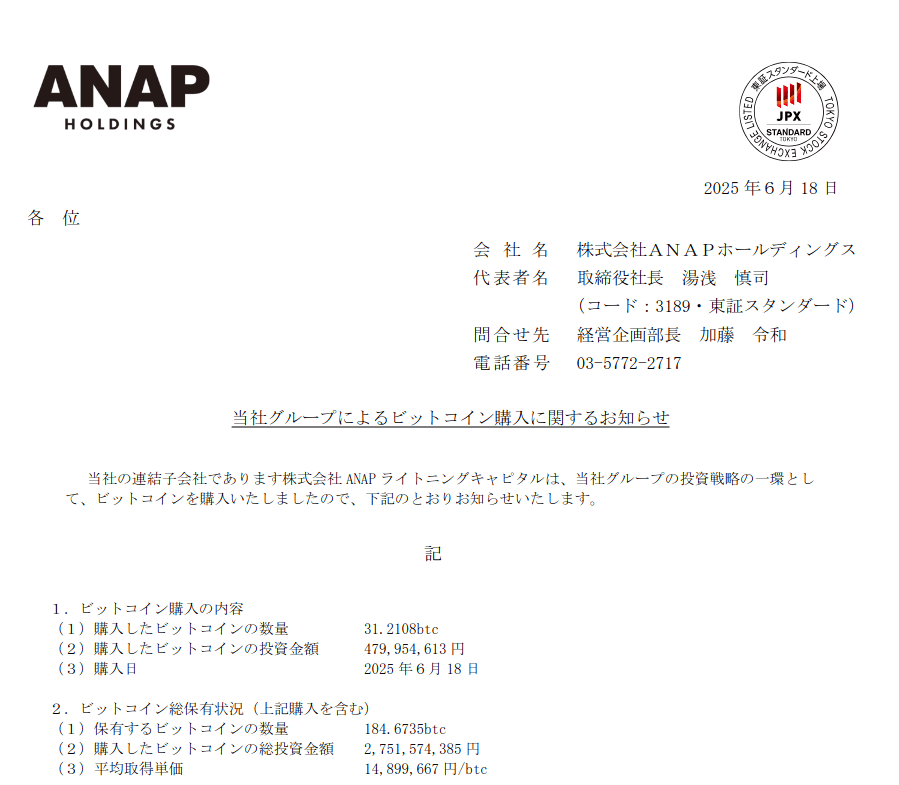 🇯🇵 El 18 de junio de 2025, #ANAP Holdings anunció oficialmente que su empresa del grupo ANAP Lightning Capital ha comprado: