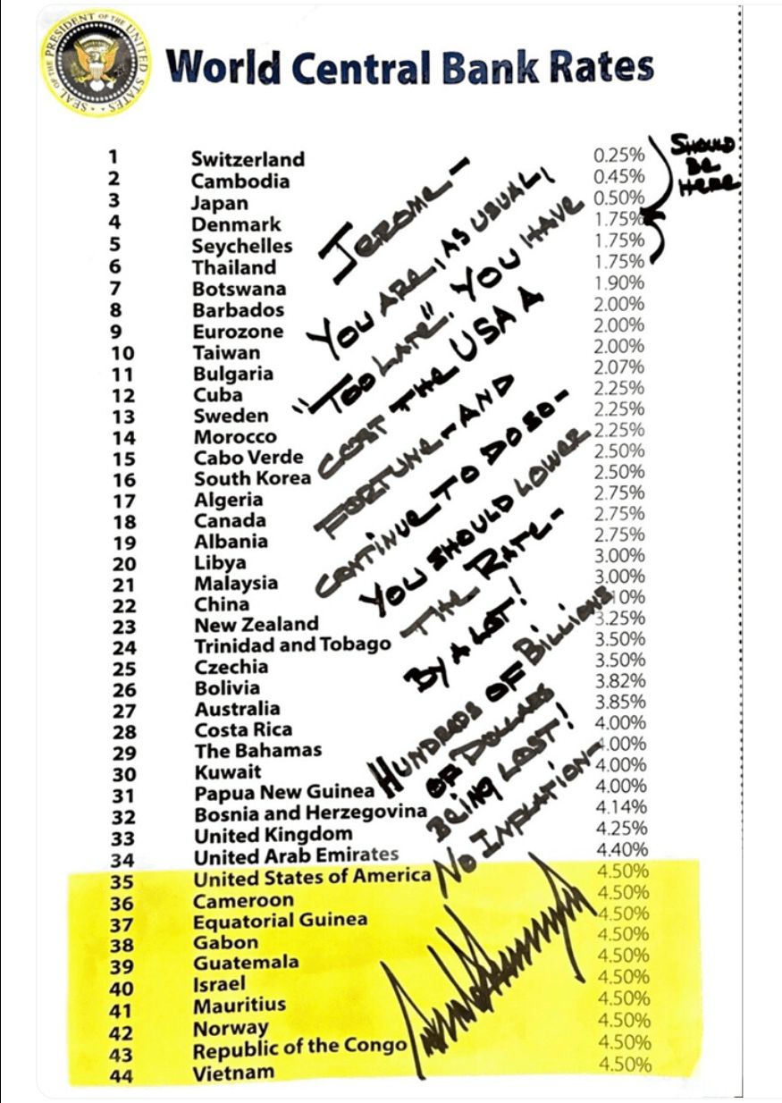 La imagen añadida a la publicación incluía un mensaje escrito por Trump con un marcador en una mesa que mostraba las tasas de interés de los bancos centrales en diferentes países: