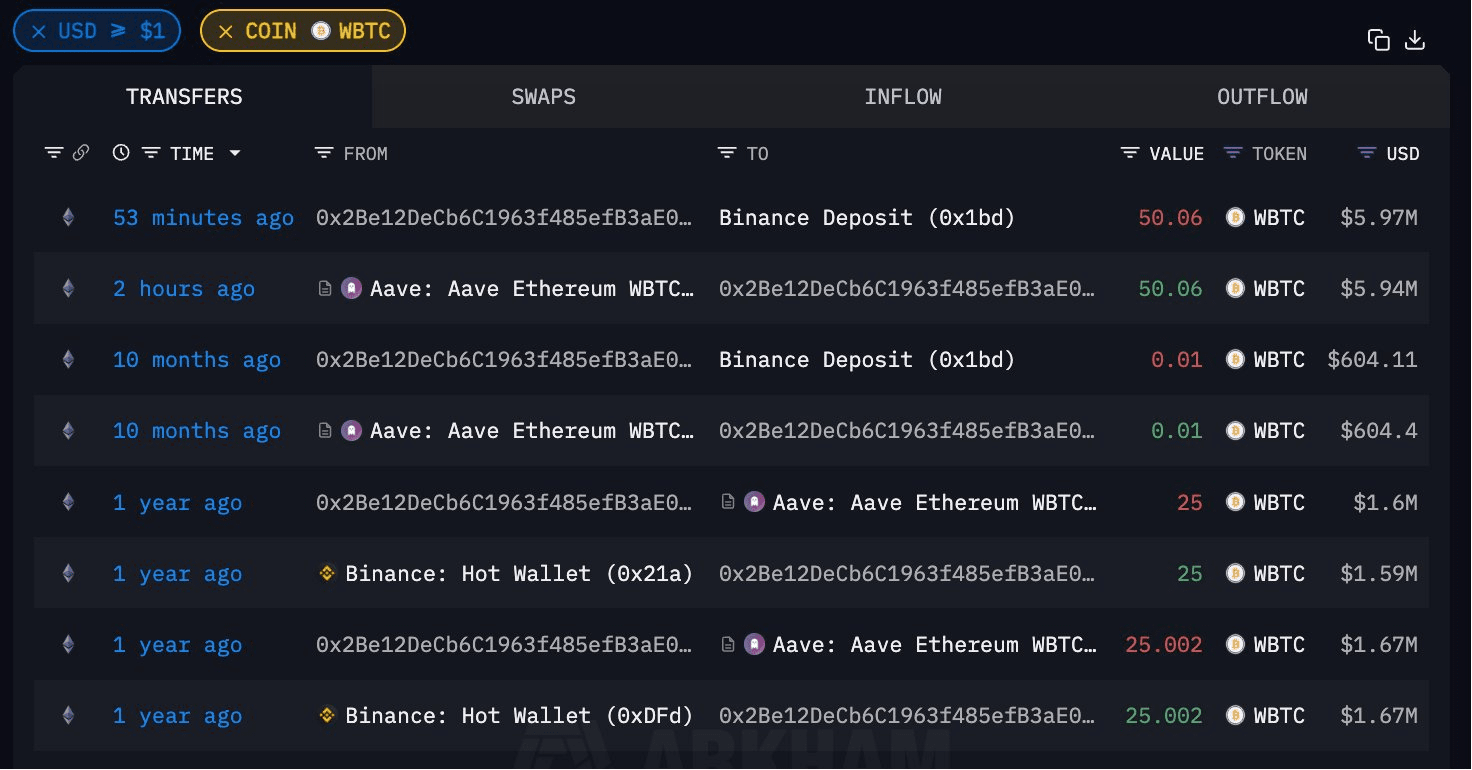 Según los datos del analista on-chain Ai 姨 (@ai_9684xtpa), una ballena grande ha vendido toda su cantidad de 50 WBTC comprados en abril de 2024 a un precio promedio de 65,135 USD/BTC.