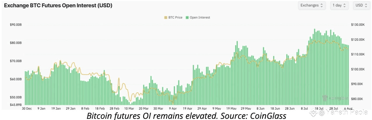 El interés abierto total en futuros de Bitcoin (OI) — el valor de los contratos de derivados pendientes — se mantiene alto en alrededor de 79 mil millones de dólares, según CoinGlass. Aunque ligeramente por debajo del récord de 88 mil millones de dólares de OI visto a mediados de julio, el nivel actual indica que un apalancamiento significativo aún está en el sistema.