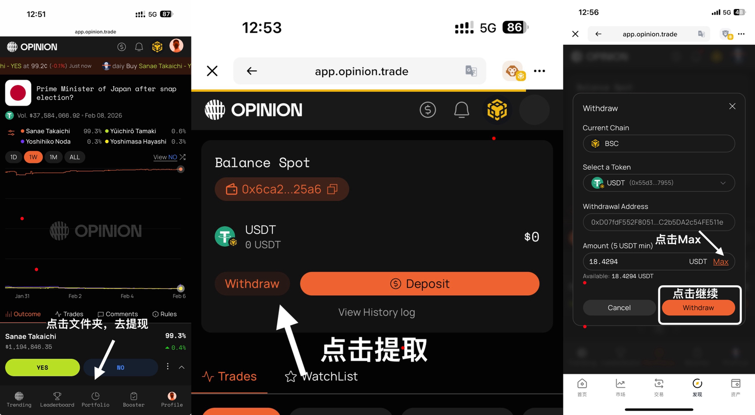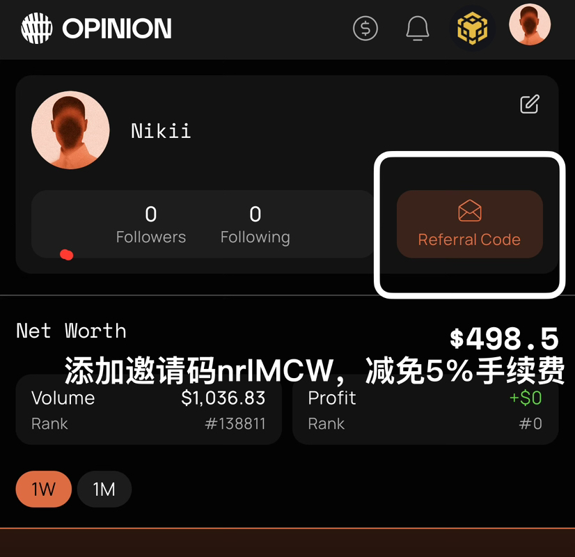Paso 3: Entra en la página de Opinion, una vez que hayas conectado tu billetera, haz clic en la página principal y completa el código de invitación: nrlMCW, descuento del 5% en tarifas