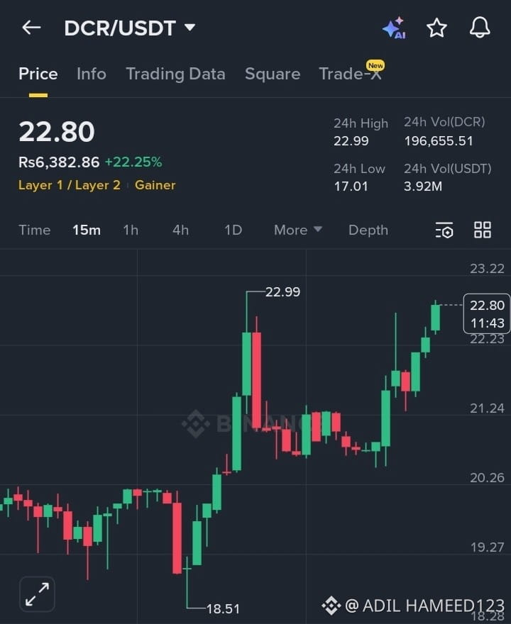 Locked Supply: Roughly 60% of DCR is currently staked, meaning it isn't available for sale on exchanges. Declining Exchange Balances: As seen in your Binance chart, the massive green candle moved from $18.51 to $22.80 with high volume. Because so much $DCR is staked, there are very few sellers to "absorb" the buying pressure, leading to these explosive vertical moves. 3. Privacy Coin Rotation