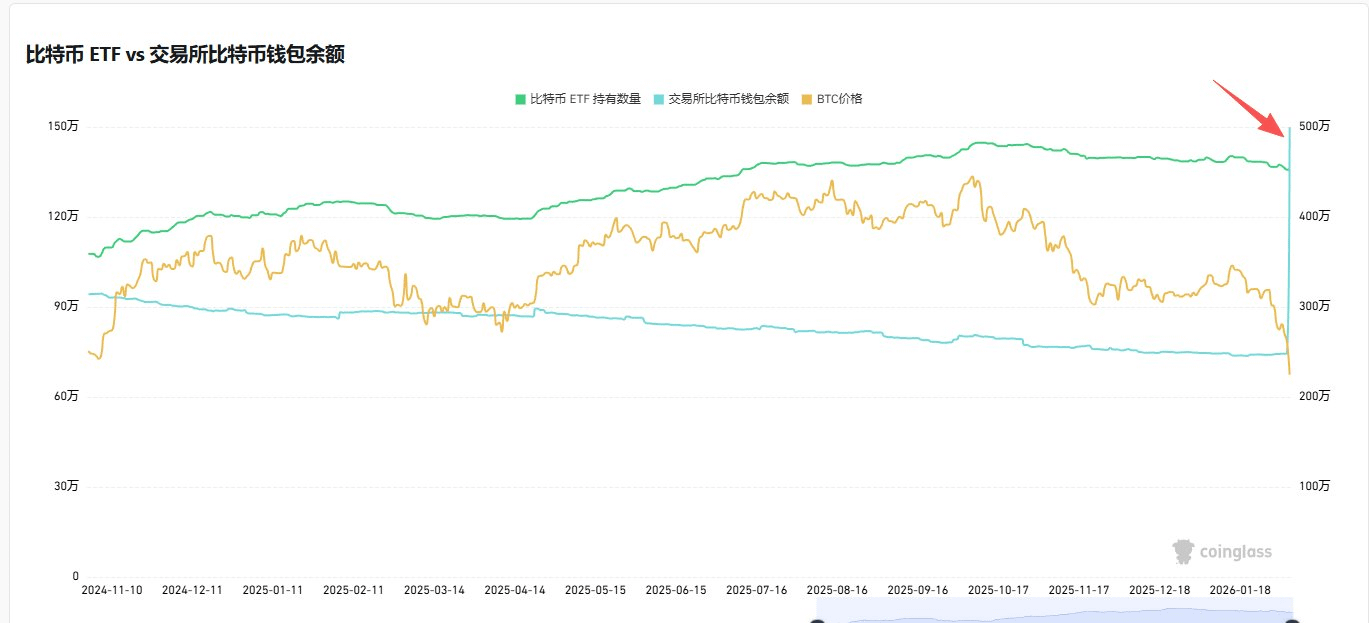 Aquí se puede ver el volumen de posiciones de los contratos en el intercambio, que alcanzó su pico el 10.11, mientras que ayer fue lamentablemente bajo. Bajo estas condiciones, excluyendo la idea de liquidar el apalancamiento, solo se puede buscar el movimiento de las grandes instituciones que tienen BTC o las ballenas. Por casualidad, abrí el gráfico de datos del saldo de la billetera del intercambio de ETF de Bitcoin VC, y ayer, el saldo de BTC del intercambio creció al doble. Normalmente es una línea de nivel muy estable, por lo que no hay que dudar: la caída de ayer fue causada por la venta masiva de grandes tenedores, instituciones y ballenas. En este mercado que ya tiene poca liquidez, sin compradores en la parte inferior, es fácil que se derrumbe.