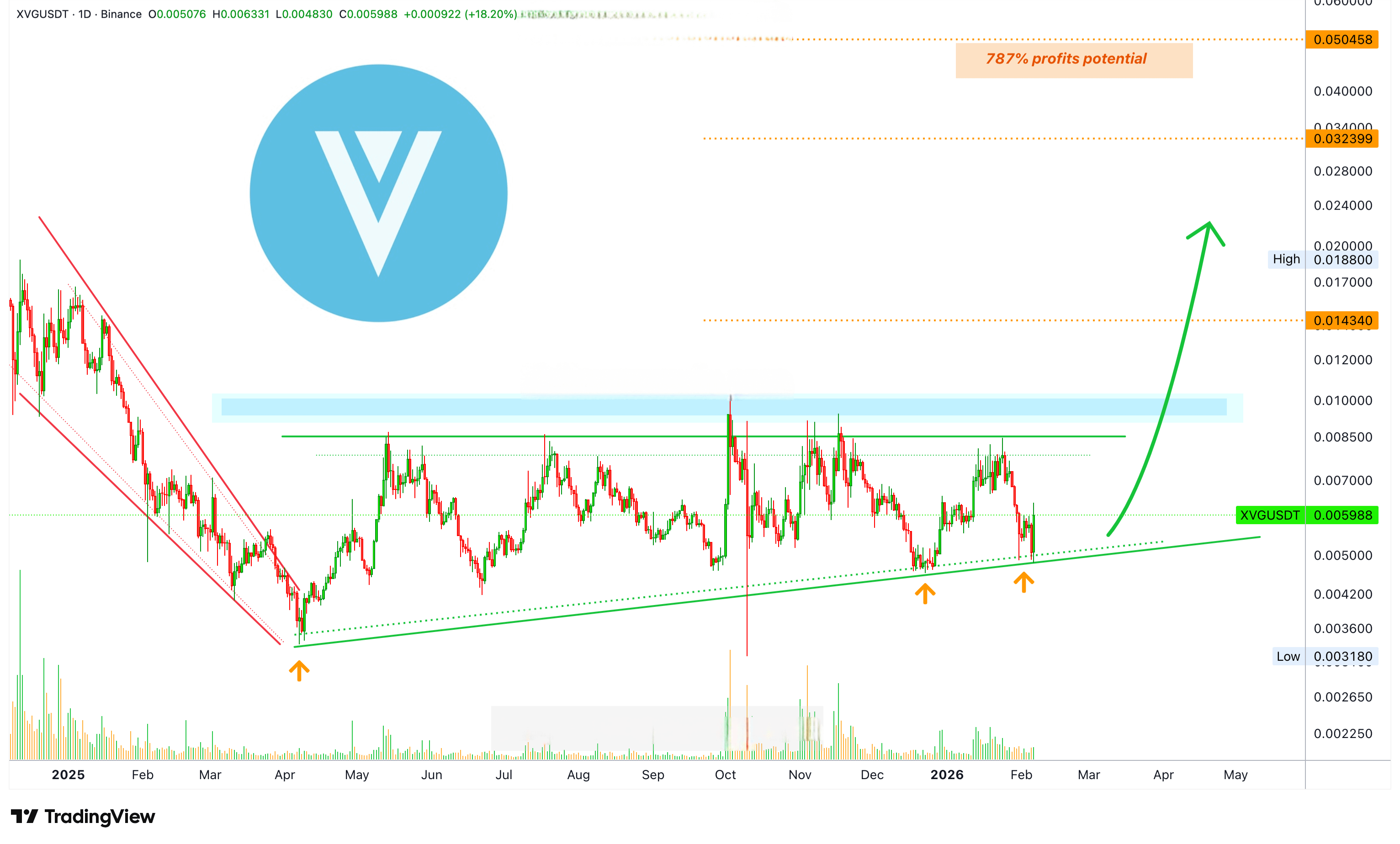 Piensa en todas las fluctuaciones que ha tenido el mercado. Todos los temblores, todas las oscilaciones, todo el ruido. Sin embargo, Verge continúa moviéndose dentro de una línea de tendencia ascendente perfecta en la parte inferior. Esto revela la fuerza.
