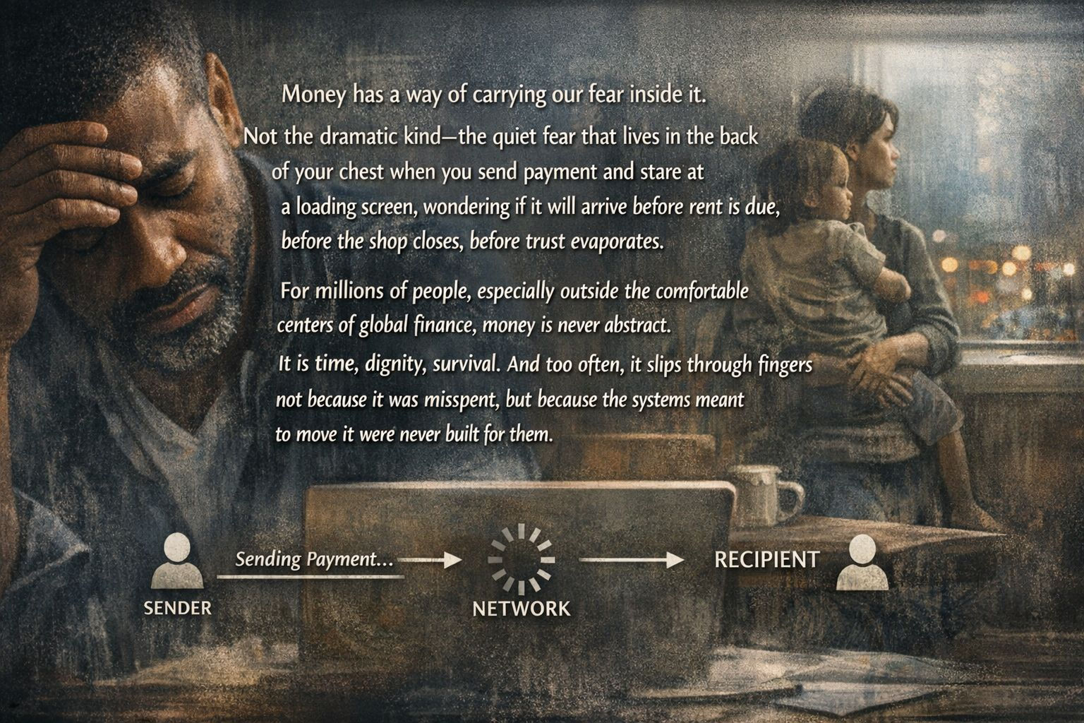 El dinero tiene una manera de llevar nuestro miedo dentro de él. No el tipo dramático, sino el miedo silencioso que vive en la parte posterior de tu pecho cuando envías un pago y miras una pantalla de carga, preguntándote si llegará antes de que venza el alquiler, antes de que cierre la tienda, antes de que la confianza se evapore. Para millones de personas, especialmente fuera de los cómodos centros de finanzas globales, el dinero nunca es abstracto. Es tiempo, dignidad, supervivencia. Y muy a menudo, se escapa entre los dedos no porque se haya gastado mal, sino porque los sistemas destinados a moverlo nunca fueron construidos para ellos.