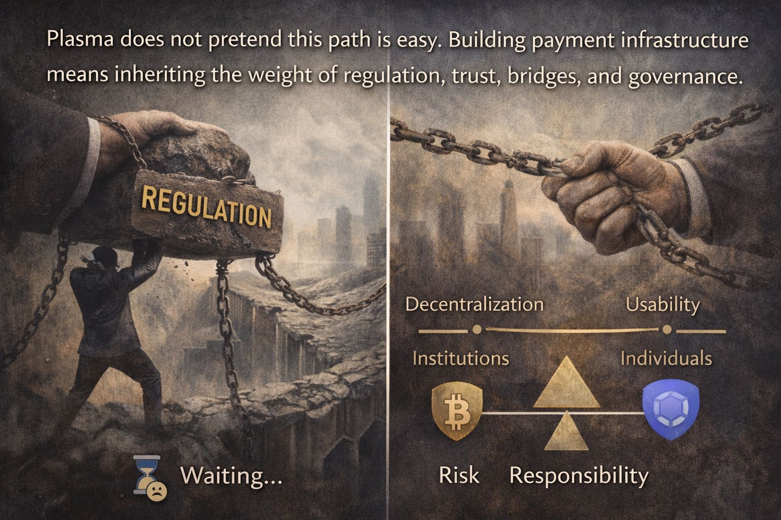 Plasma no finge que este camino sea fácil. Construir infraestructura de pago significa heredar el peso de la regulación, la confianza, los puentes y la gobernanza. Significa resistir atajos que harían que el crecimiento fuera más rápido pero los cimientos más débiles. Significa vivir con tensión: entre descentralización y usabilidad, entre instituciones e individuos, entre velocidad y seguridad. Lo que importa no es la ausencia de riesgo, sino la disposición a cargarlo de manera responsable.