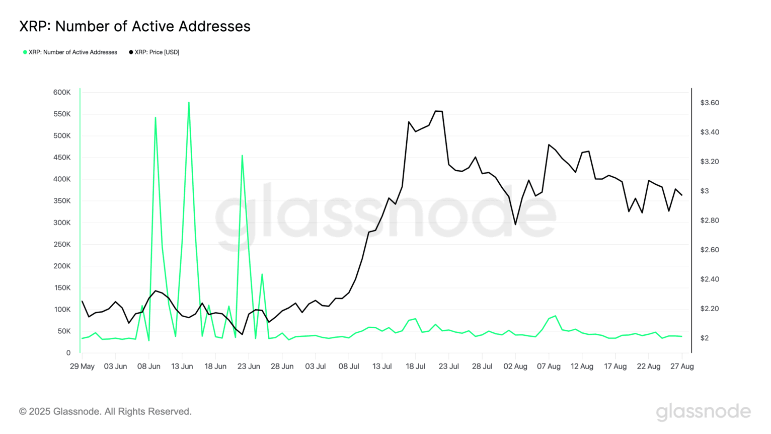 Los datos de Glassnode revelan que el número de direcciones activas en la red XRP cayó a 38,303 a partir del 27 de agosto. Estos niveles en el número de direcciones activas indican que los movimientos de precios no están respaldados por la red. Sin embargo, en junio se observaron fuertes aumentos que superaron las 500,000 direcciones activas. Desde finales de julio, el número ha disminuido y sigue un camino predominantemente horizontal.