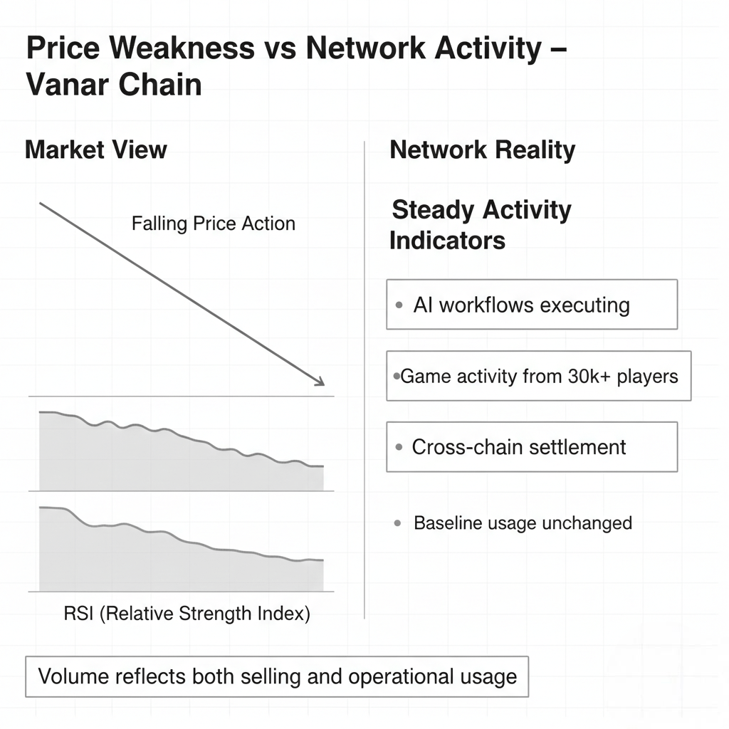 During this period, both types existed. Real selling was happening—holders exiting positions, speculative interest fading. But underneath that, Vanar Chain's infrastructure kept consuming VANRY at rates determined by application usage rather than market conditions.
