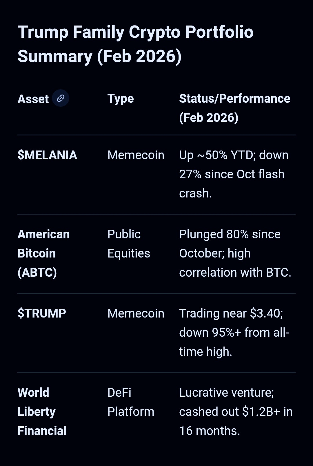 A partir de febrero de 2026, el extenso portafolio de criptomonedas de la familia Trump ha enfrentado una caída significativa del mercado, pero el memecoin oficial de Melania Trump, $MELANIA, ha mostrado una sorprendente resiliencia en comparación con otros activos vinculados a la familia. Mientras que las principales tenencias como American Bitcoin (ABTC) y la moneda oficial $TRUMP han caído en picada, el token $MELANIA recientemente superó tanto a Bitcoin como a Ethereum en ganancias acumuladas hasta la fecha.