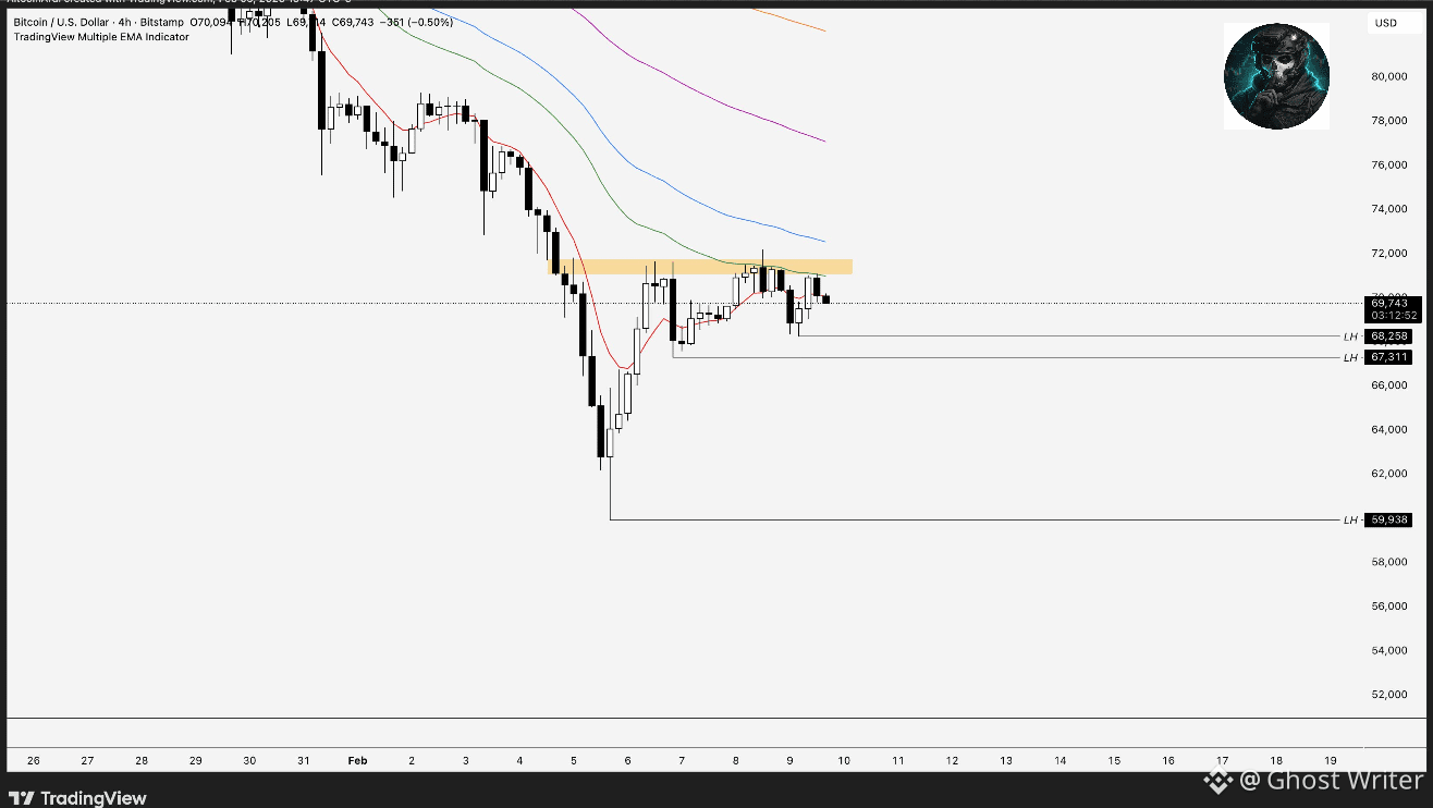 Price has now rejected from the highlighted supply zone around $71K–$72K, showing sellers are defending this area aggressively. This zone aligns closely with the EMAs overhead, adding extra resistance pressure.