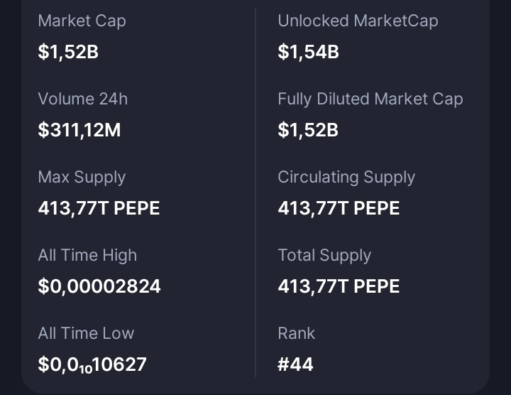 These numbers show that PEPE is already a large cap meme coin. It is not an early stage project. A market cap above 1.5 billion USD confirms that.